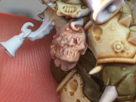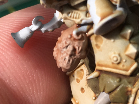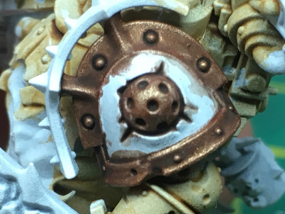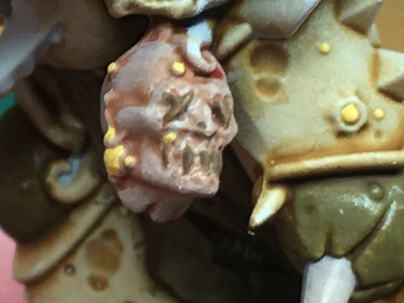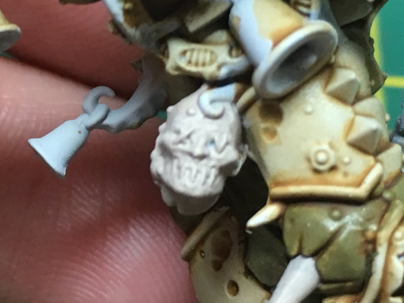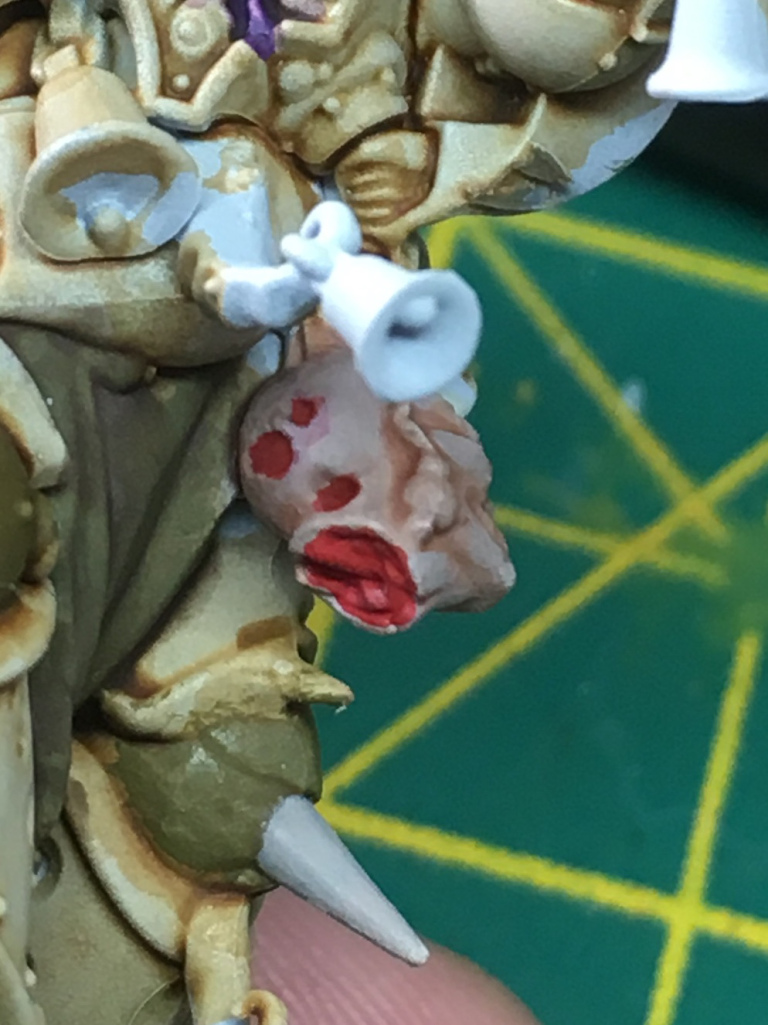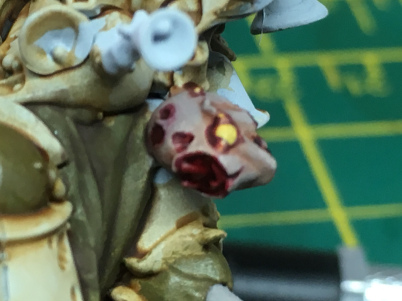 - Here I painted the chord sealing the head’s eyes and mouth. I originally did them with Vallejo Beige Brown, but you can see in later pictures I changed it to Citadel Abaddon Black.