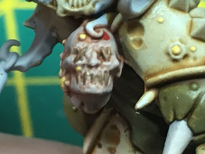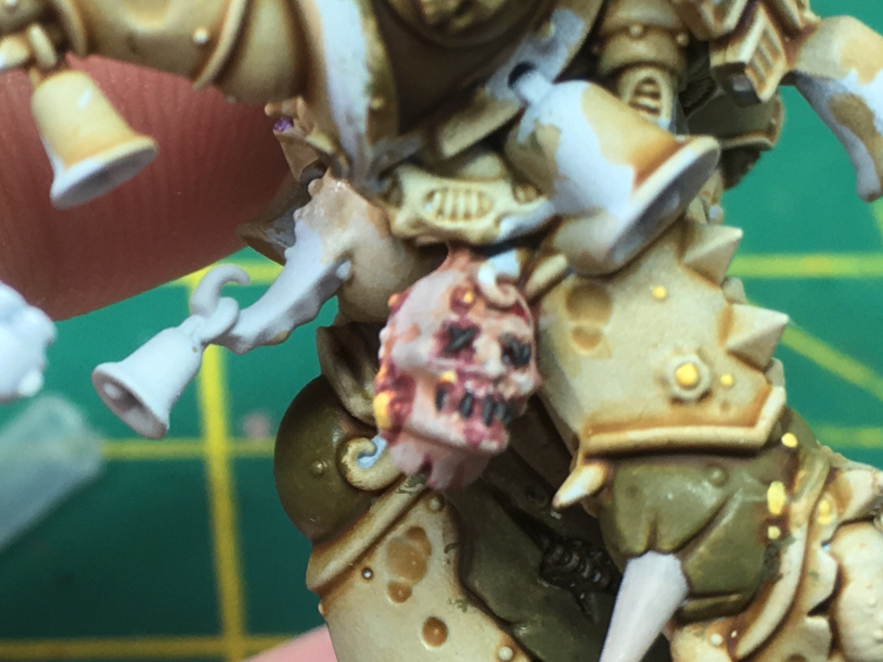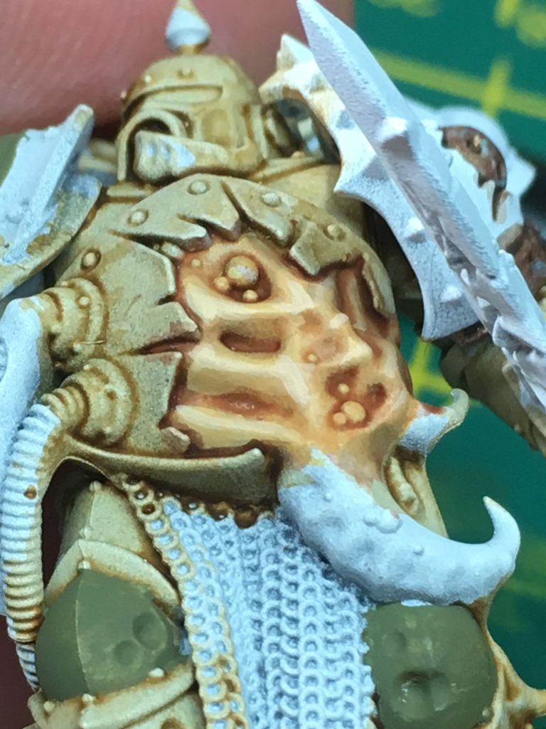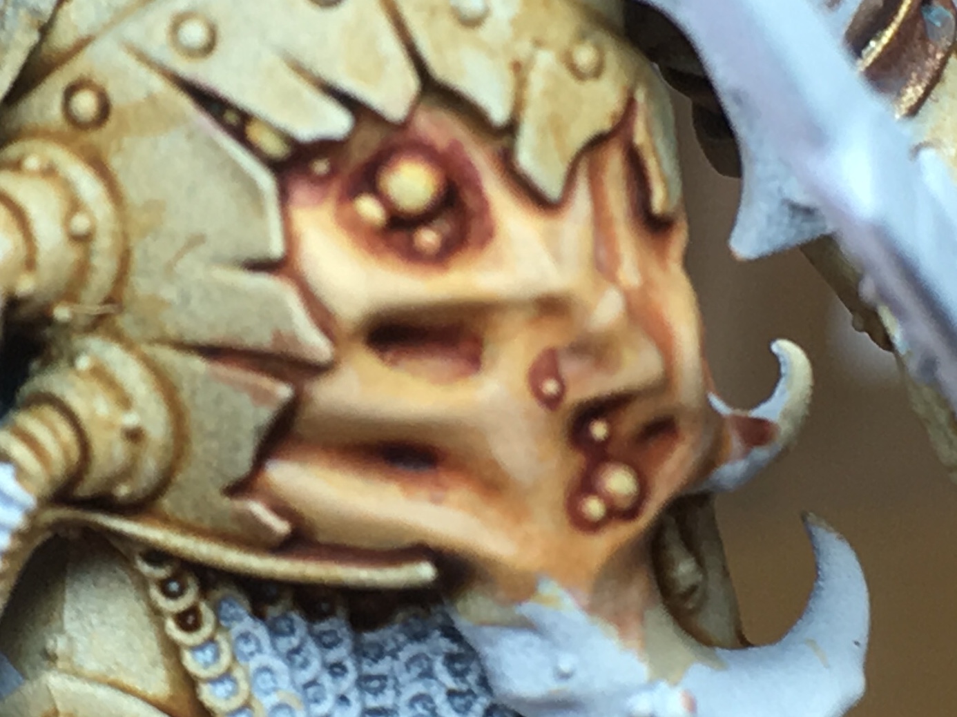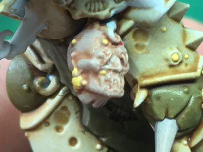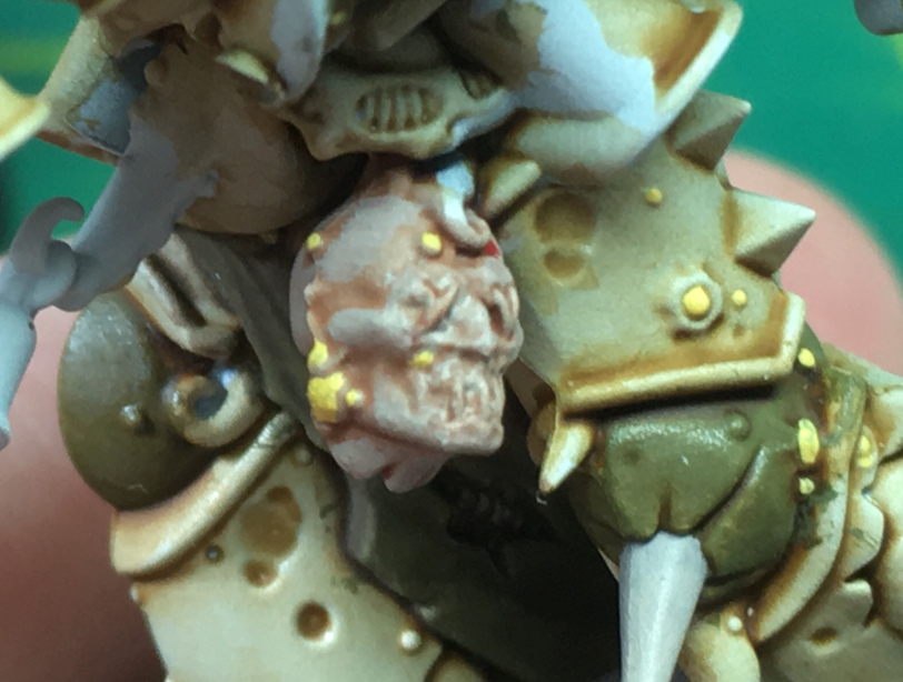 - A mix of Citadel Averland Sunset, Citadel Yriel Yellow and white is used on the pustules/blisters/boils