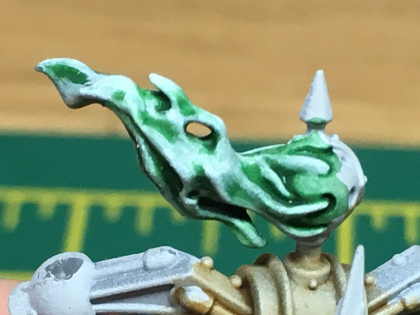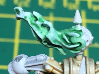 - Wash with the chosen colour of shade (in this case, Citadel Biel Tan Green)