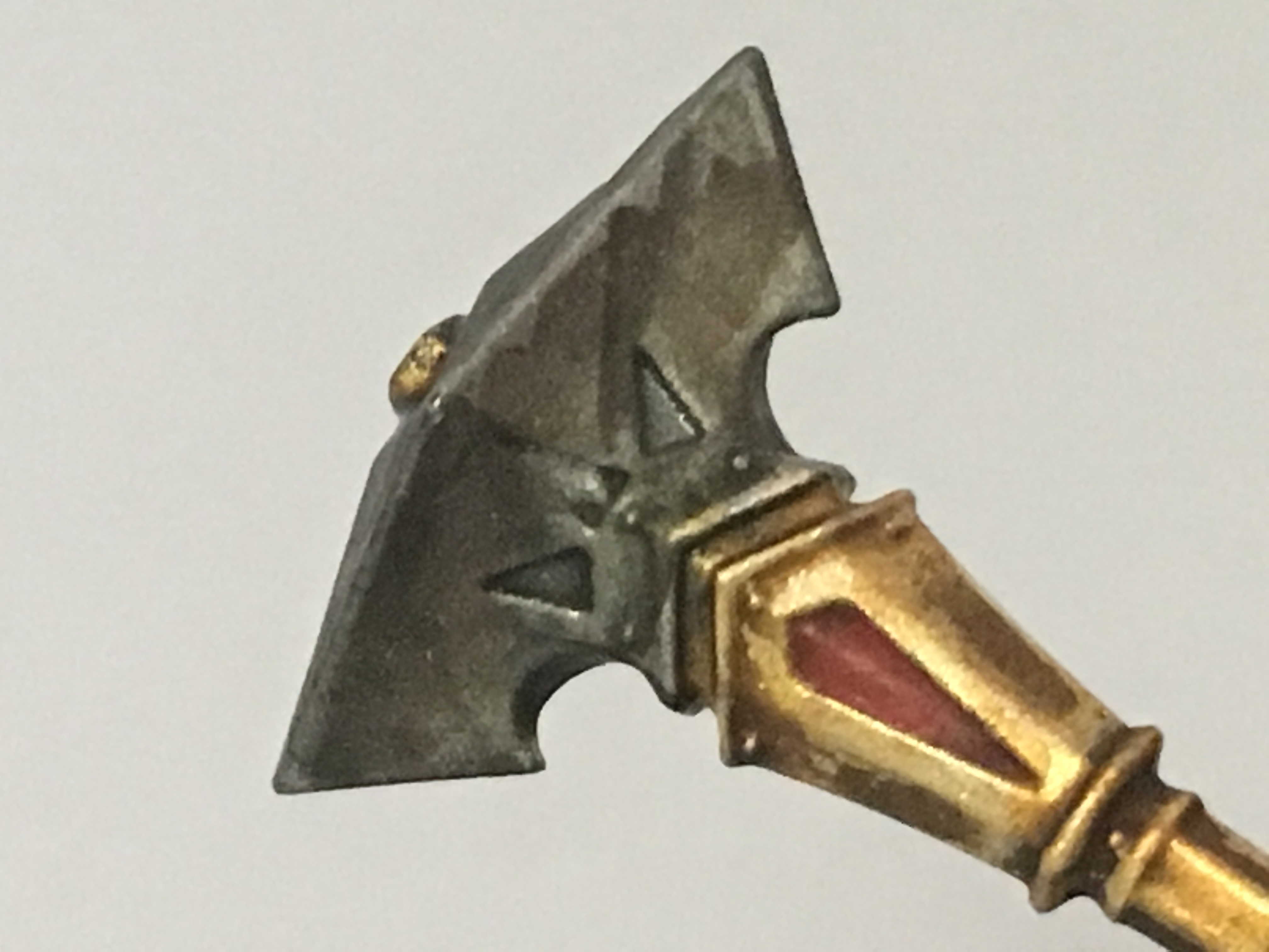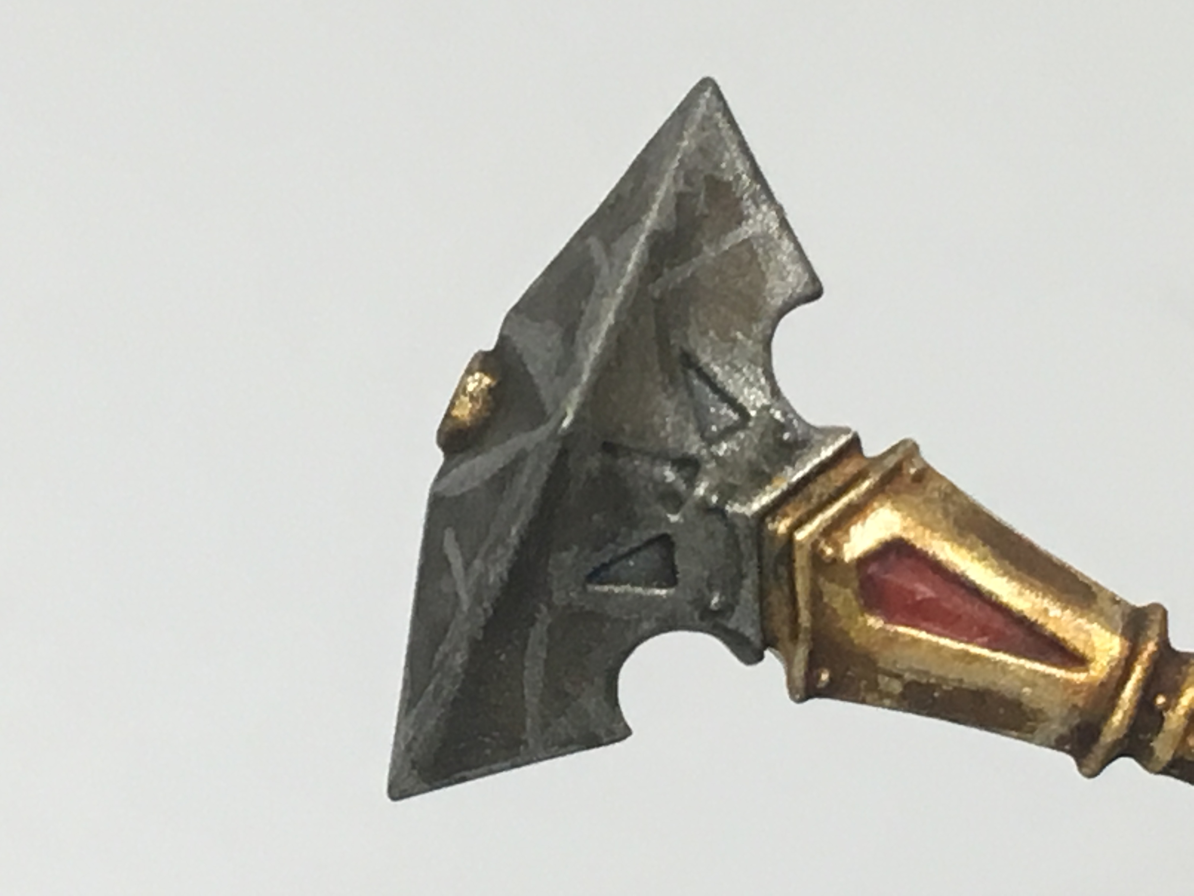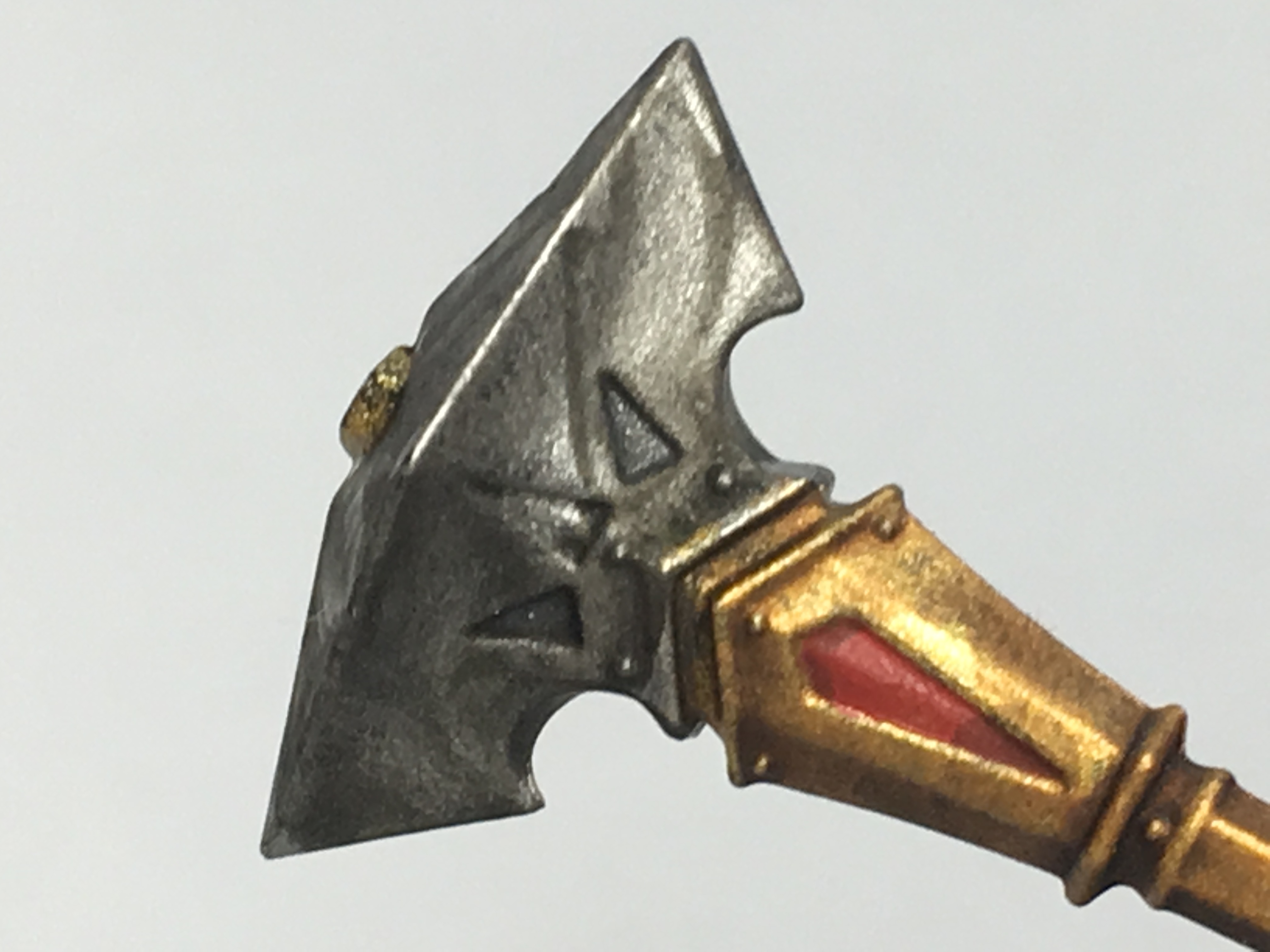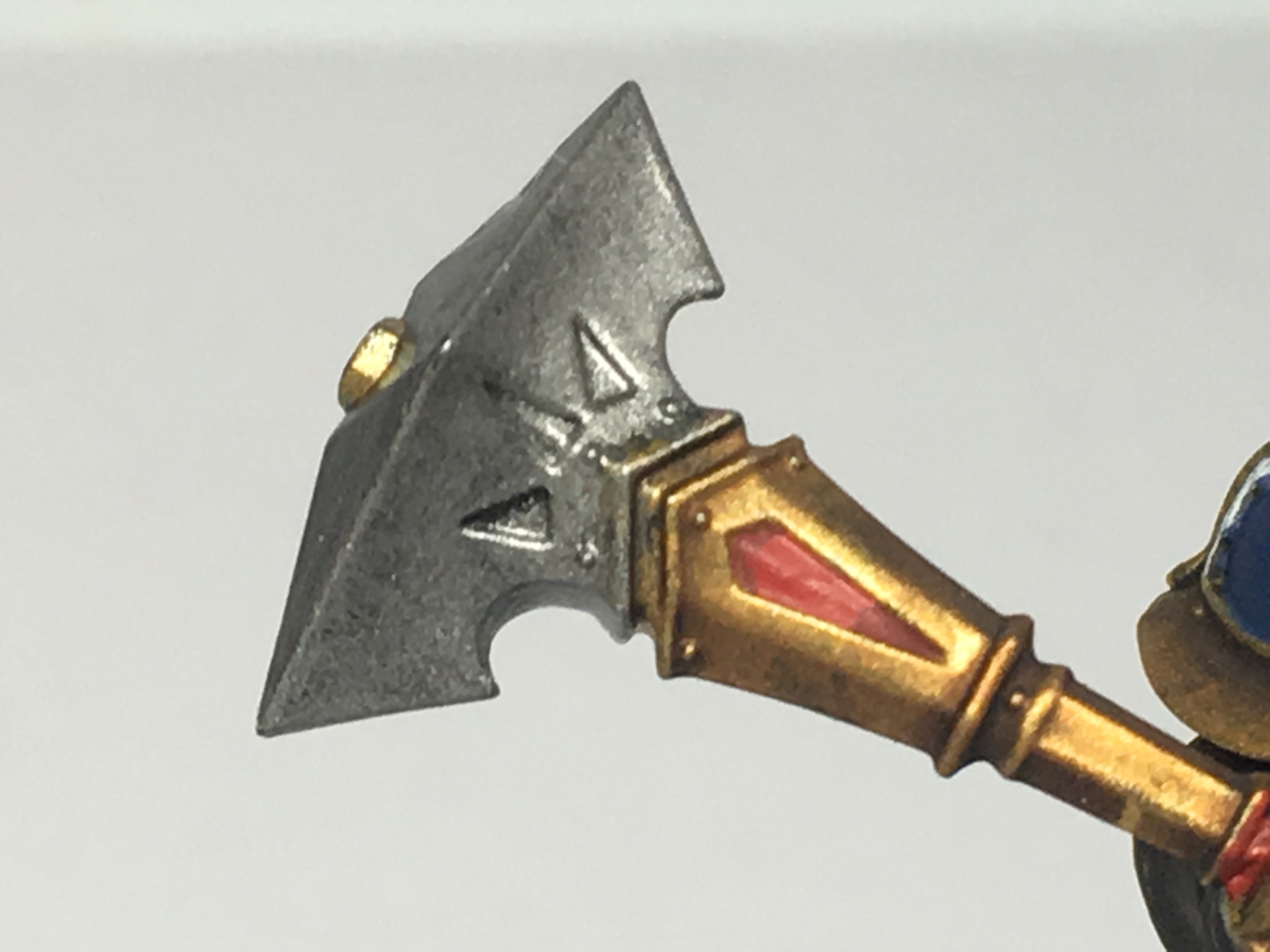 The shaft of the weapons and the red sections near the maul head were painted with Mephiston Red, then washed with Citadel Druchii Violet. You could easily reapply the Mephiston Red and highlight with a Mephiston Red/Fire Dragon Bright mix, but as these are for the tabletop, I stopped short of that. If this is something you’d like to see, let me know and I’ll paint one of them up to get some pictures here.
