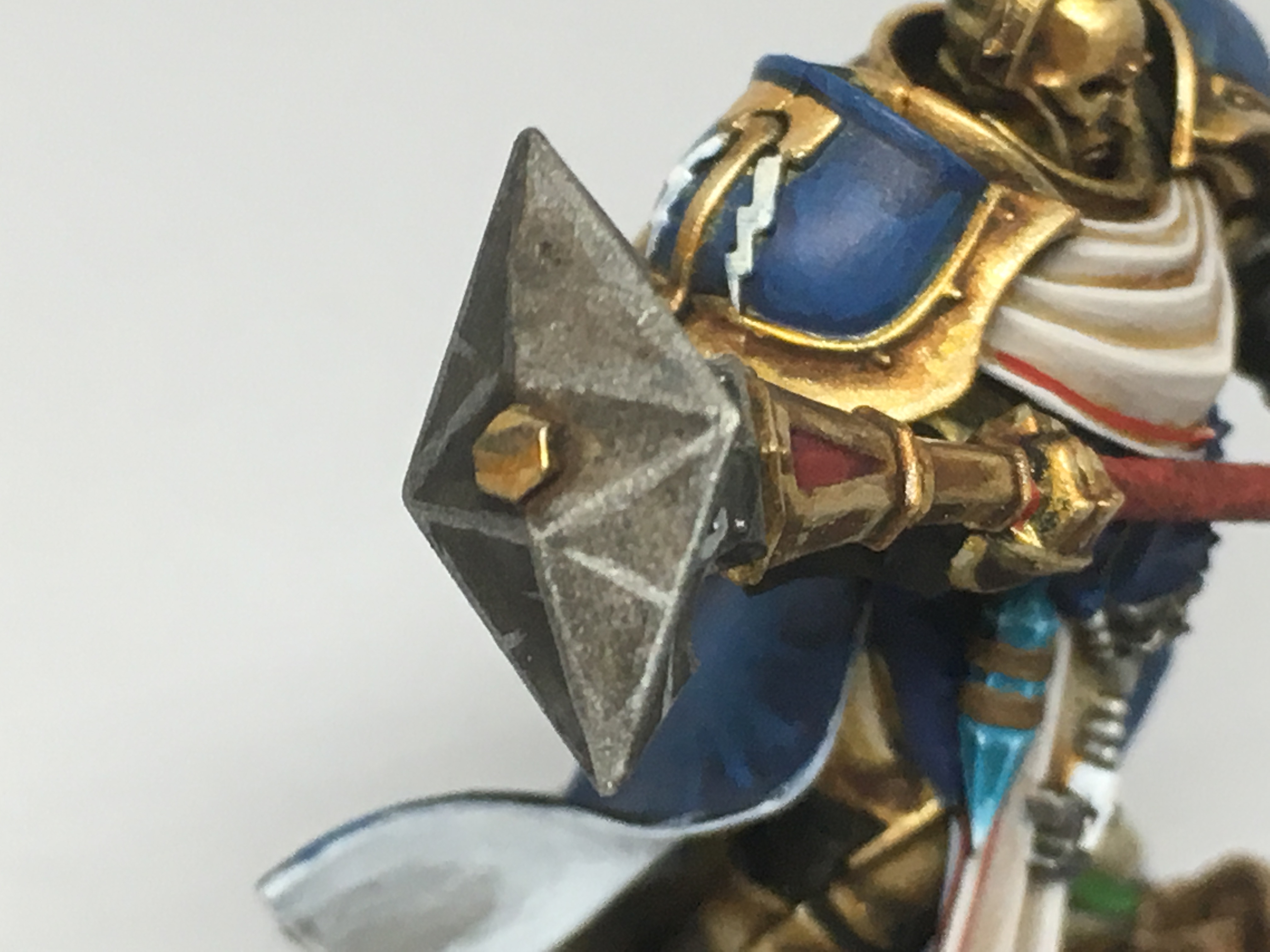 The shields were easy to do once the gold is out of the way. The lightning bolts were painted with pure white, and the shield has already been painted with Kantor Blue and shaded with Drakenhof Nightshade. The Anvil is Citadel Leadbelcher with a Nuln Oil shade. In the images below, the shield would be at about a 45 degree angle rotated anti-clockwise, which is why the blue highlights are on the right hand side.