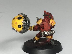The special weapons and Goblins I picked out a few details on, painted their straps, added some gold to the front of some of the helm. The Looney has had the ball painted yellow to resemble a massive, skull-smashing smiley, and his armour and gloves have been touched up using the colours above.